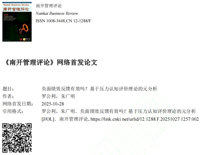 2025年10月,山东科技大学经济管理学院罗公利教授与在读博士生朱广明在《南开管理评论》网络首发题为“负面绩效反馈有效吗?基于压力认知评价理论的元分析”的文章。
